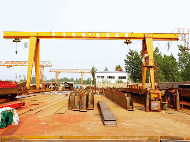 电动葫芦门式起重机是有轨运行的中小型起重设备,主要由门架(主梁、支腿、下横梁等)、起升机构、运行机构及电控部分组成,以电动葫芦作为起升机构,工作时沿主梁工字钢下翼缘运行。门架结构分箱形和桁架两种,箱形工艺好,制作方便;桁架自重轻,抗风能力强。整机具有自重轻、结构简单、安装维修方便等特点,适用于中小起重量范围内的厂矿、货场及仓库等室外场所作一般装卸吊运工作。