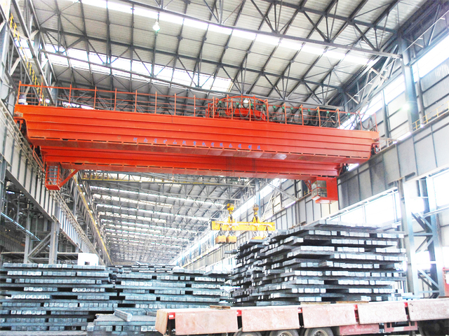 用于搬运长件板坯、棒材等黑色金属。回转通过两种形式实现,一种形式为挂梁回转,即挂梁为双层结构,上层挂梁通过滑轮组与钢丝绳缠绕,下层挂梁配有多台电磁吸盘或夹钳,可随驱动机构回转一定角度。另一种形式为小车回转,即小车为双层结构,上层小车布置有起升机构,下层小车为运行小车,上面铺设有环形轨道,上层小车可沿环形轨道回转。
